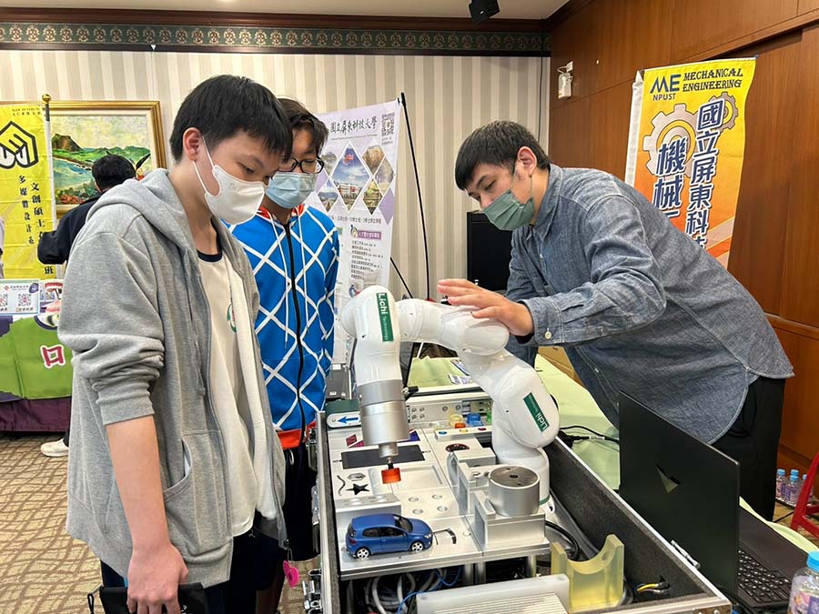 Lichi Technology’s general manager, Ming Yi Lu and one of their engineers, Hsu-Hua Chen (an alumnus of NPUST’s Mechanical Engineering master’s program), were also present at the booth to help explain the applications of robotic arms in the industry. When Chen was studying his master’s degree, he chose to focus on a combination of robotic arms and machine vision for his thesis research topic, so he was able to provide the visiting students with quality insight. After experiencing the robotic arm for themselves, the junior high and high school students were able to get a better feel for the operating principles and the future applications of AI artificial intelligence. They also had a chance see how robotic arms are replacing human labor, and consider how they might plan their future studies and careers in light of current trends.