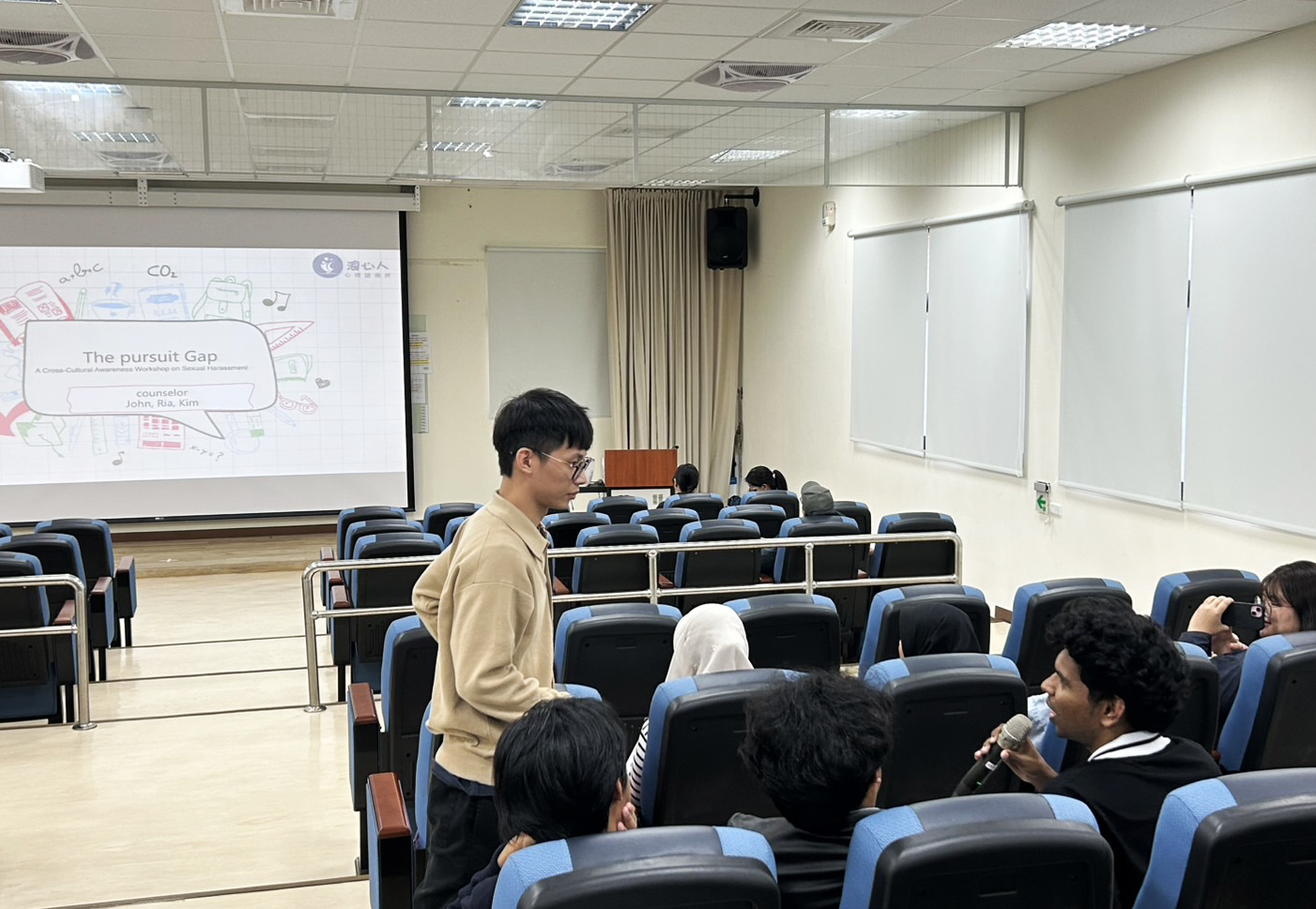 本校國際事務處為強化境外生對性別教育與文化差異所產生之落差,特於上(12)月29日於國際學院IC113教室舉辦「我們之間的追求落差:跨文化性平覺察工作坊」,邀請「浪心人心理諮商所」三位講師分別透過跨文化覺察及了解、情境式對話、合宜之異性互動模式,以及詢問參與學生關於男女互動的界線,吸引菲律賓、越南、印尼、緬甸、巴基斯坦、尼泊爾、印度、泰國、汶萊、貝里斯、海地、聖露西亞等國境外生及臺灣本地生熱烈參與。