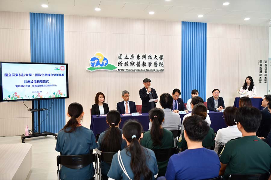屏科大張金龍校長表示,感謝傑出校友陳良榮董事長在關鍵時刻的支持,猶如及時雨。現代獸醫臨床正快速朝向微創化、精準化與高品質照護發展,這批設備的加入,將使本校獸醫教學醫院在臨床服務、急重症監測與微創手術上更具完整性與競爭力。這不只是硬體的增加,更是醫療品質與教學深度的提升,讓獸醫師與學生能在第一線實作中接軌趨勢、累積經驗,也能為屏東地區更多毛小孩提供更安心、更專業的醫療照護。國歡企業集團陳良榮董事長在致詞時表示,本次捐贈這不僅延續國歡企業與國內各大學獸醫系長達約 20 年的產學共好計畫,更期望透過捐贈精密醫療器材協助屏科大在精準醫療與學生實習實作上的專業精進,更對母校從早期的屏東農專發展至今,成為涵蓋農、工、獸醫等學院多元領域的綜合型大學深感榮耀。