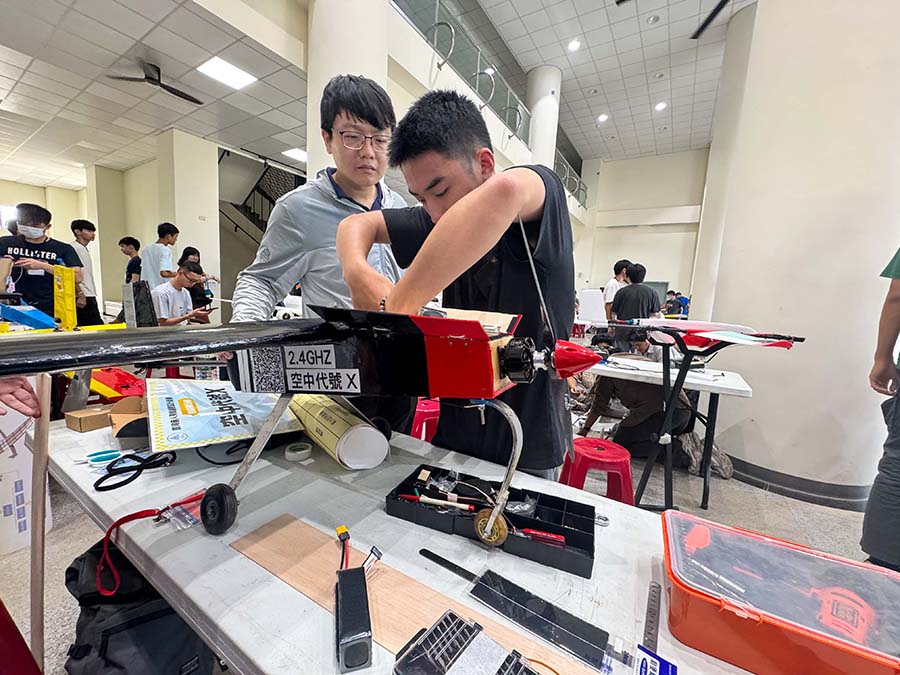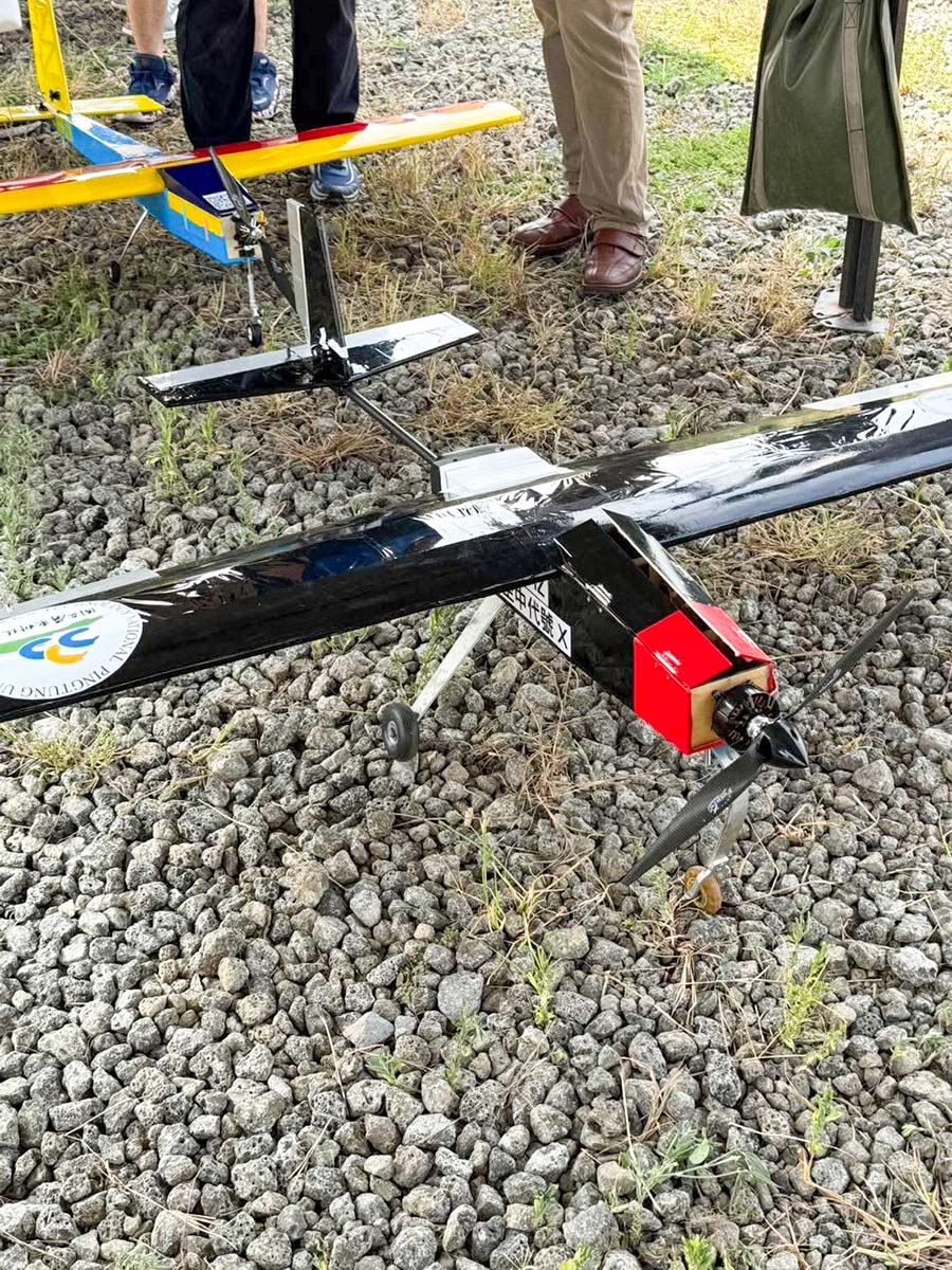 「空中代號X」定翼型無人機,由屏科大徐子圭教授、徐嘉偉副教授、張鴻彬研究員共同指導學生吳宇翔、王天駿、陳建豪、陳柏瑄設計製作,該機翼展達 2 公尺,以夾板與巴沙木構建全機隔框及骨架,採用高翼穩定的前三點設計,兼具良好飛行穩定性與操作可靠度;同時具備可額外載重 5 公斤貨物的能力,並透過高升阻比與大推重比的優化設計,提升整體飛行性能與任務執行彈性,順利在本次「2025臺灣無人飛機創意設計競賽」獲得評審青睞。參賽學生吳宇翔表示,由於自己是電機科出身,從來沒有想像過設計飛機,在師長的指導下看到我們自己設計的飛機成功離地起飛分別完成大會指定的飛行科目,覺得令人振奮。
