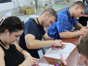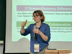 訪團交流行程安排與本校通識教育中心主任簡赫琳教授座談,內容涵蓋台灣政治制度、國際關係及民主發展歷程,現場互動熱烈,學員踴躍提問與老師交流觀點。隨後參訪景觀暨遊憩管理研究所,由所長周宛俞副教授介紹台灣在綠色農業、永續環境與綠色照護的實踐案例,並引導分組討論。學員們比較台、德兩國在農業政策與環境管理之差異,提出結合藝術推廣環境教育的構想,以小組形式上台發表討論成果,呈現學習心得與觀察視角;同時在療癒庭園進行實務體驗,透過花草採摘與植物染 DIY,親手操作感受自然素材價值。