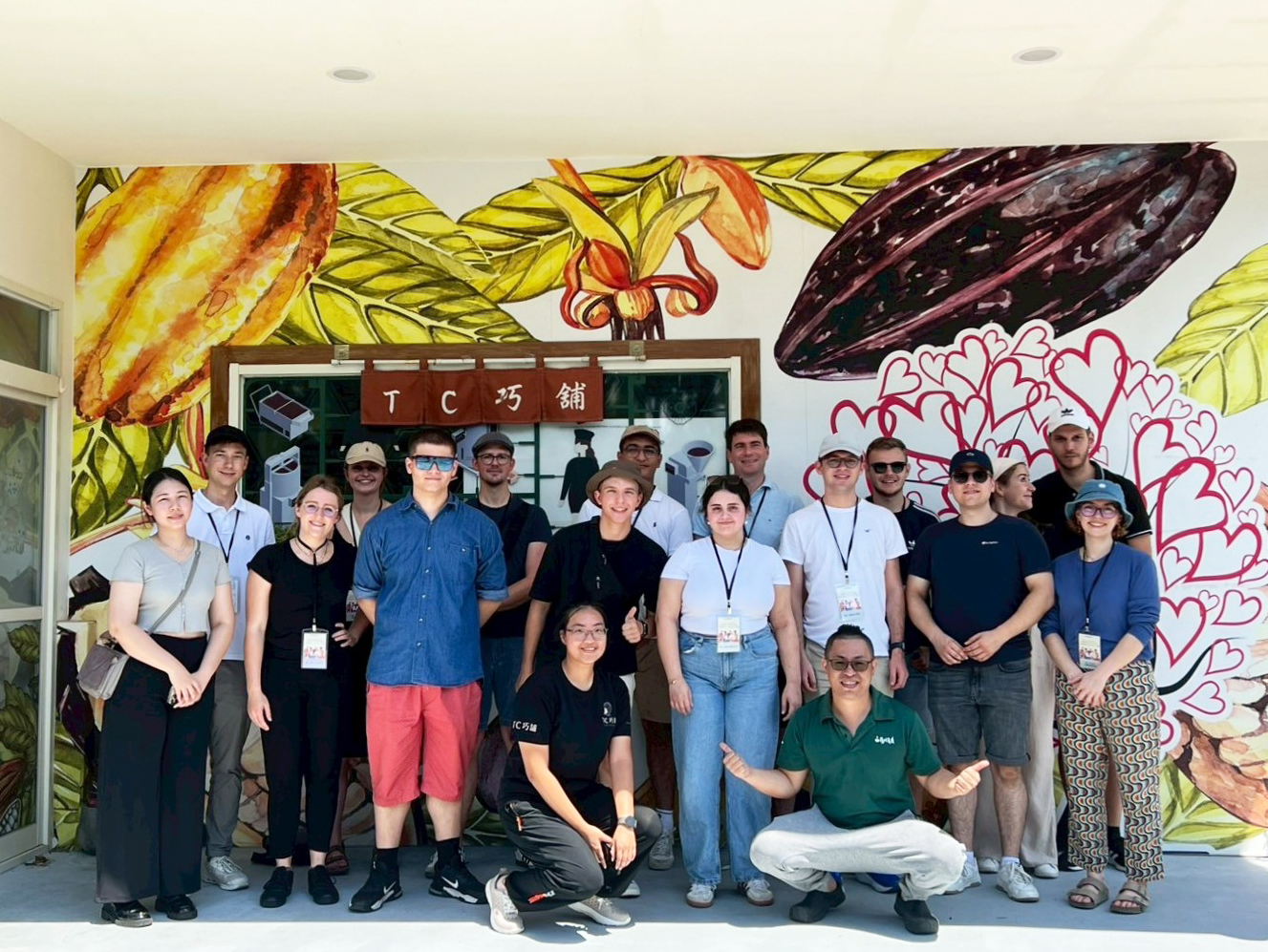於文化層面則安排訪團前往屏東縣王船文化館進行交流,深入了解迎王平安祭的歷史背景與儀式特色;也前往佳冬鄉拜訪林仔邊自然文史保育協會及向陽香莢蘭園,探討光電棚下香莢蘭栽培模式,就再生能源與環境永續展開跨國交流。最後一站來到 TC 巧鋪,完整體驗從可可栽培、採收到巧克力製作過程,並參與 DIY親身感受農產品轉化為加工品的樂趣。